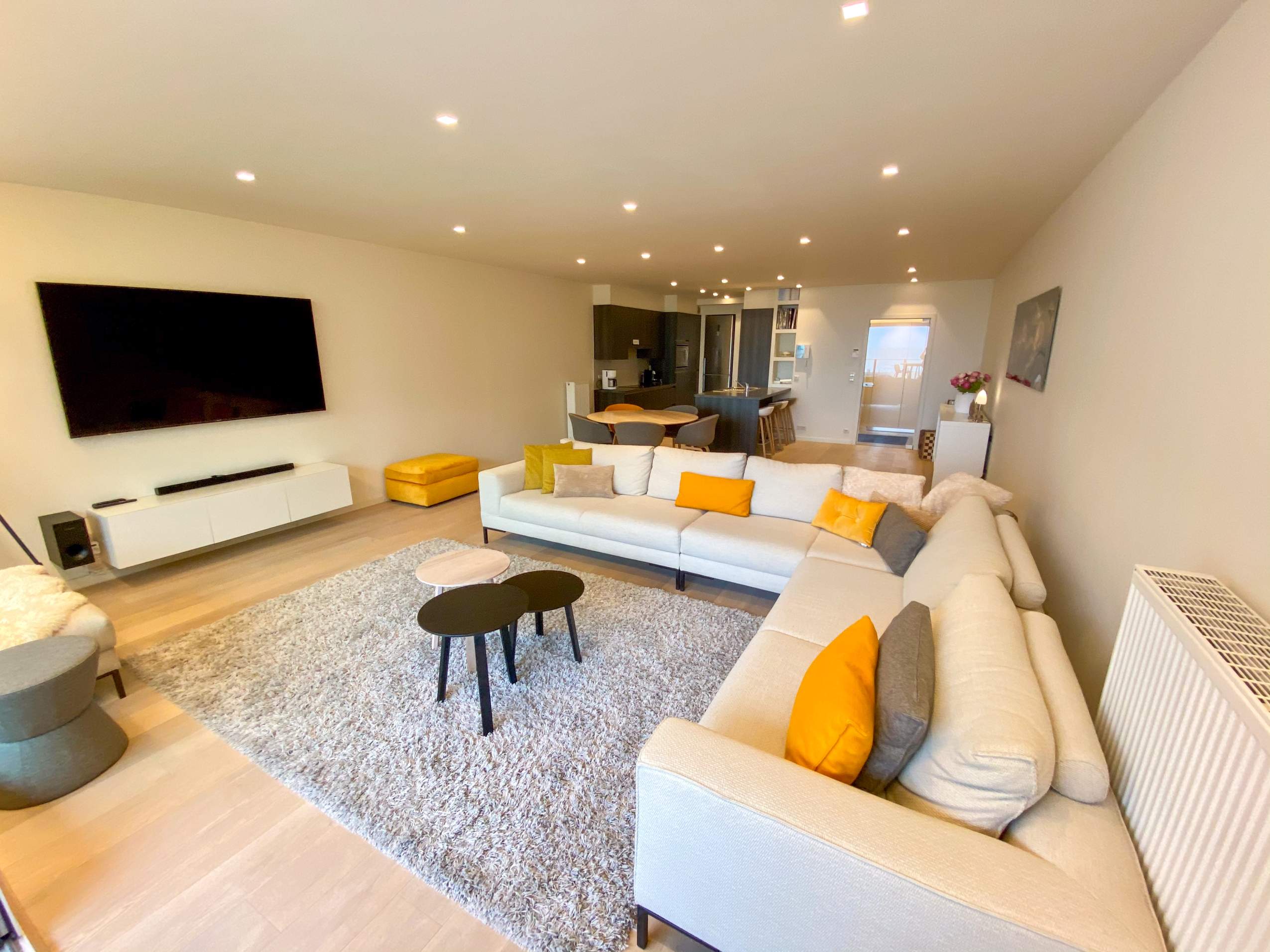 Gezellige leefruimte met groot flatscreen en luxe zitcomfort Gratis WiFi in het hele appartement Goed uitgeruste open keuken